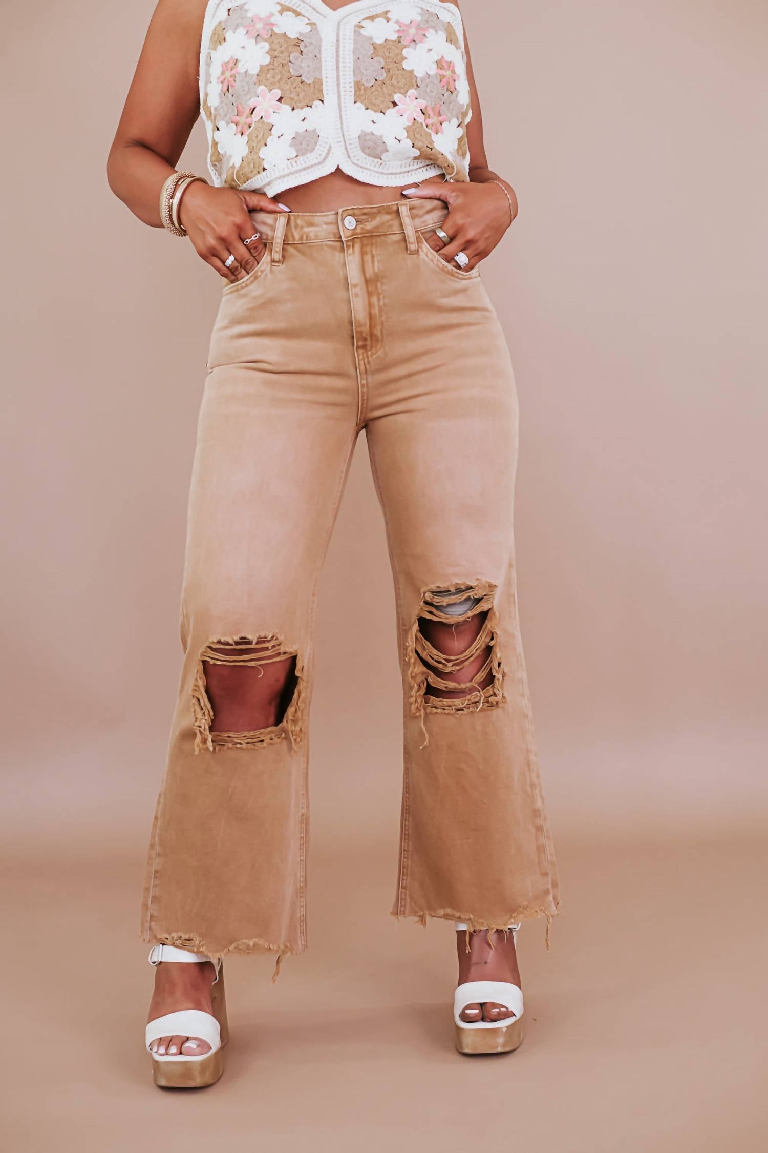 Combine esta calça jeans de perna larga com mules, slides ou suas sandálias de tiras favoritas. A calça jeans Brooks Distressed da VERVET BY FLYING MONKEY é uma homenagem chique à moda dos anos 90, desenhada no tom liso Kiss Of Cali. Com caimento relaxado e pernas alargadas, esta calça jeans apresenta cós ultra alto de 29 cm e costura interna curta de 68 cm. Confeccionada em 100% algodão, oferece fecho de botão e bolsos para maior funcionalidade. Perfeitamente adequada para a primavera, esta calça jeans se conserva melhor lavando-a na máquina.