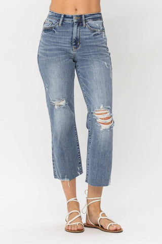 Judy Blue - Calça Jeans Crop Destroyed de Cintura Alta e Perna Larga