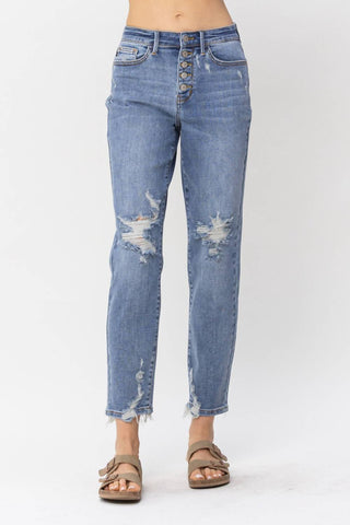 Judy Blue - Calça jeans boyfriend de cintura alta com botões e botões