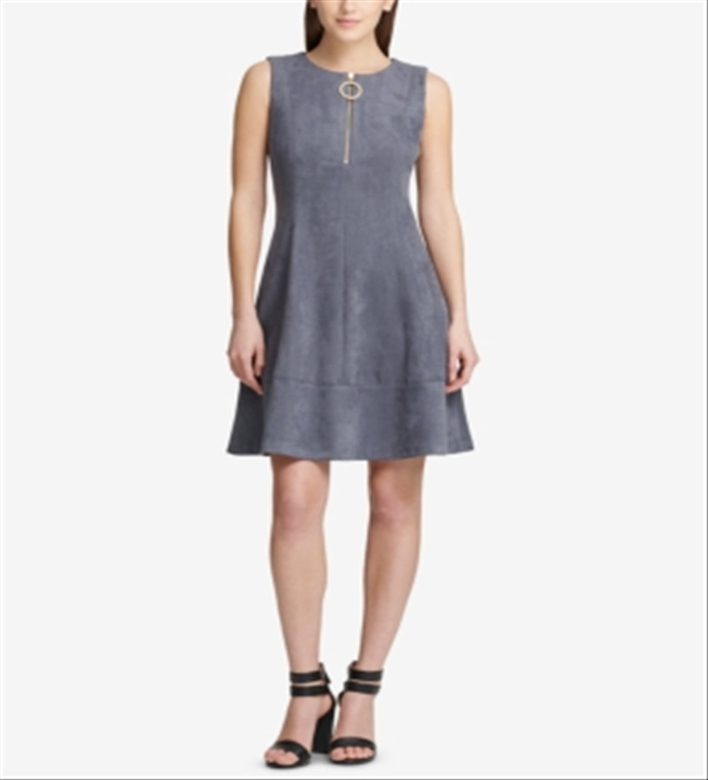 Vestido feminino DKNY sem mangas com decote em joia e acima do joelho, tamanho 16, prateado