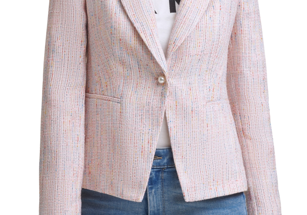 Um único botão adornado com uma linda pérola sintética realça a cintura deste blazer DKNY. | Comprimento aproximado; 22-1/2 | Gola entalhada; fecho frontal com botão de pérola sintética | Dois bolsos nos quadris | Mangas compridas com ombreiras | Forrado