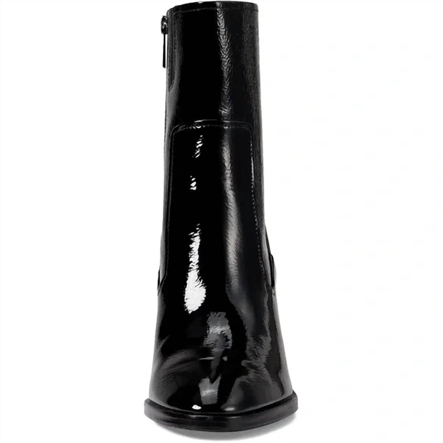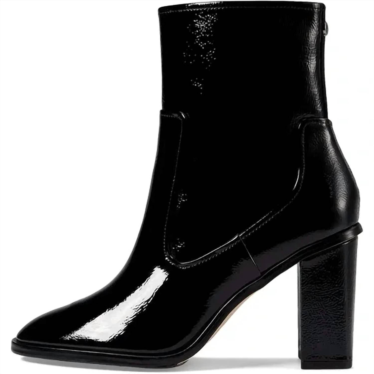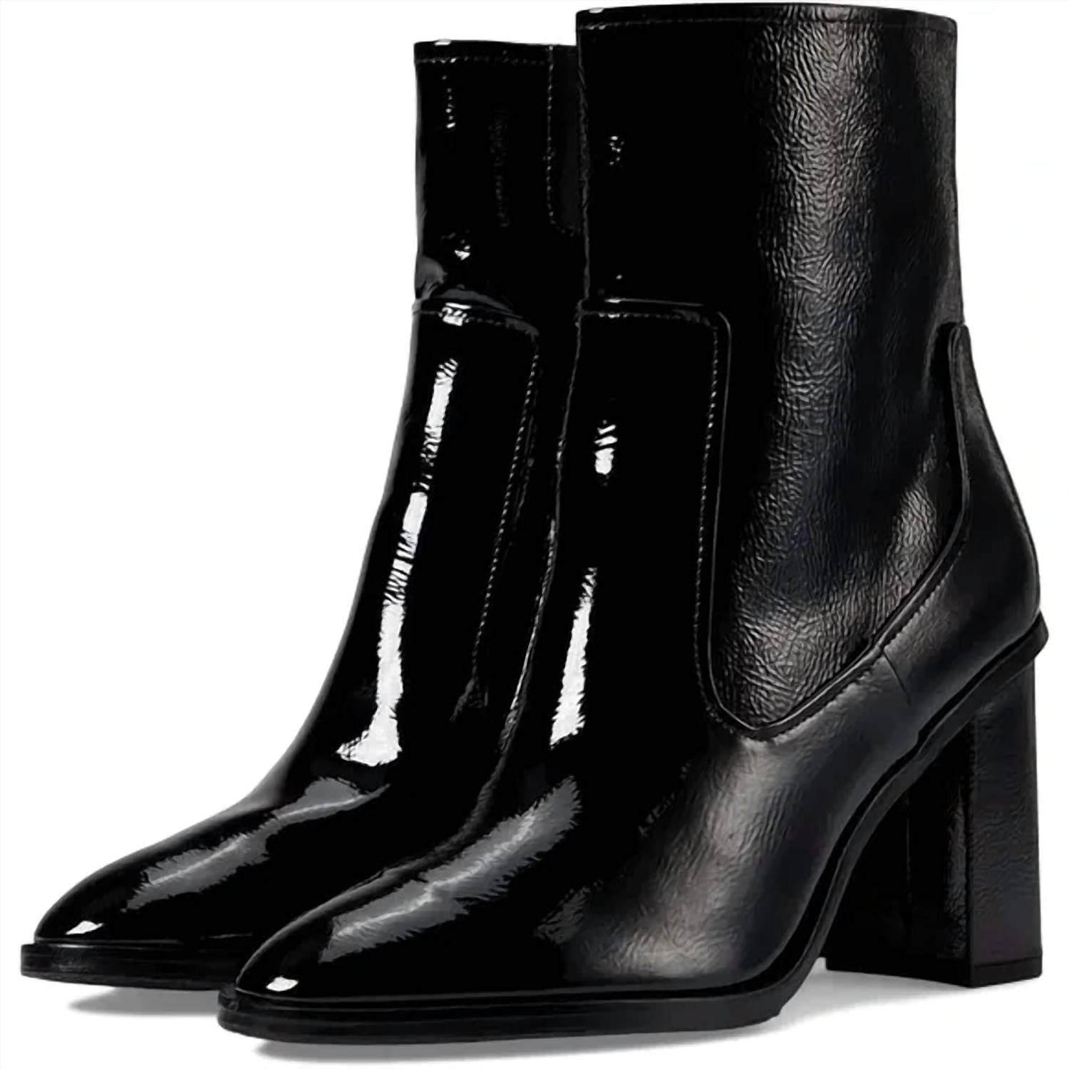 Saia com confiança e mostre seu gosto impecável com estas botas versáteis e estilosas. Seu estilo clássico fará você recorrer a elas estação após estação. Eleve seu estilo com a bota feminina de salto Maymici da Donald Pliner, com cabedal elegante em couro envernizado preto com textura amassada para um toque de glamour. Projetadas para conforto e estilo, estas botas têm bico fino e salto bloco alto com 8,5 cm ou mais. O forro em couro e a palmilha acolchoada com espuma viscoelástica garantem um ajuste confortável, enquanto o fecho em zíper facilita o calçar e descalçar. Feitas com solado em couro e borracha, estas botas são uma escolha sofisticada para qualquer ocasião.