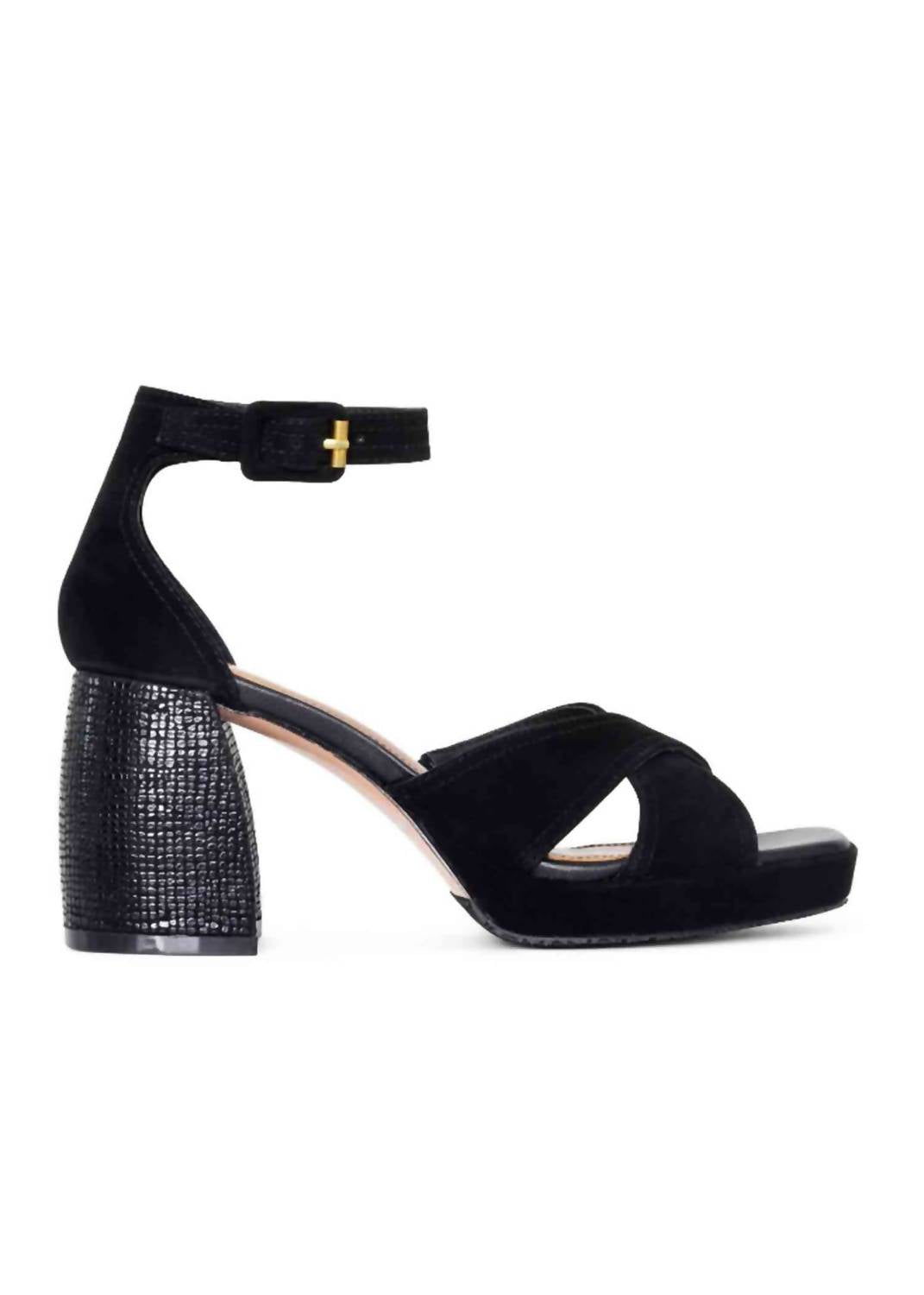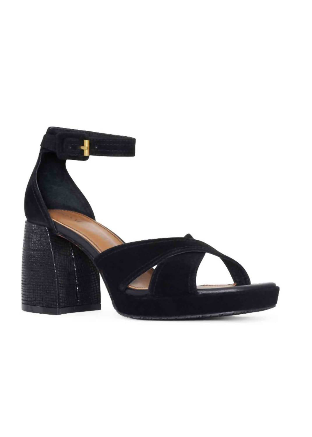 Eleve o seu look com o Salto Plataforma Feminino Trista da Donald Pliner, um acessório marcante confeccionado em camurça luxuosa na cor preta clássica. Este salto elegante apresenta bico quadrado e cabedal cruzado, complementado por uma tira de fivela ajustável no tornozelo. Completando o visual, o salto bloco escultural, com 7,6 cm de altura, plataforma de 1,9 cm e cano de 8,1 cm, garante estilo e conforto. Projetado com palmilha acolchoada em espuma viscoelástica e solado em couro polido com parte frontal em borracha, este salto de largura média equilibra perfeitamente glamour e praticidade.