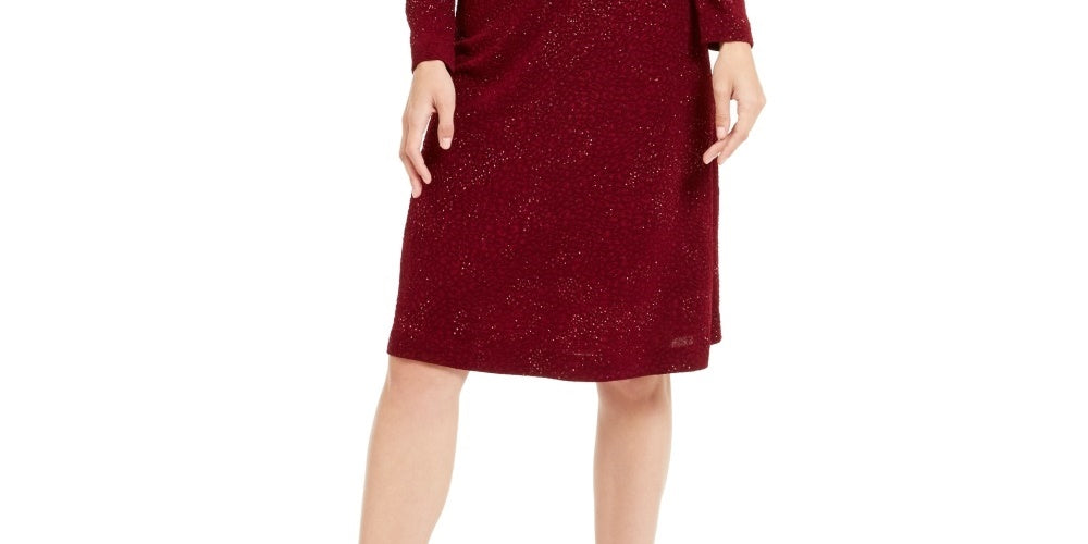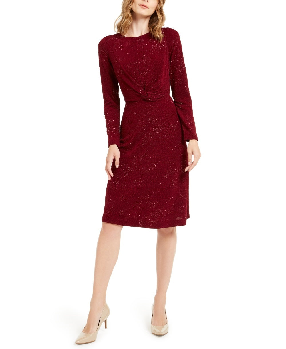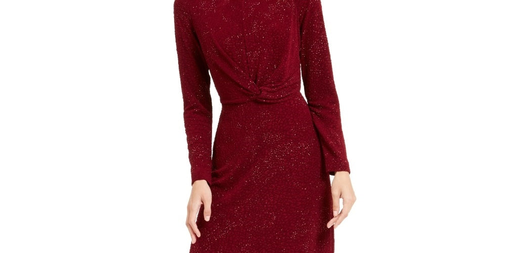 Aproximadamente 42" de comprimento do centro do pescoço até a bainha | Decote redondo | Zíper traseiro oculto | Estampa tonal completa com detalhe de glitter; detalhe de torção na cintura