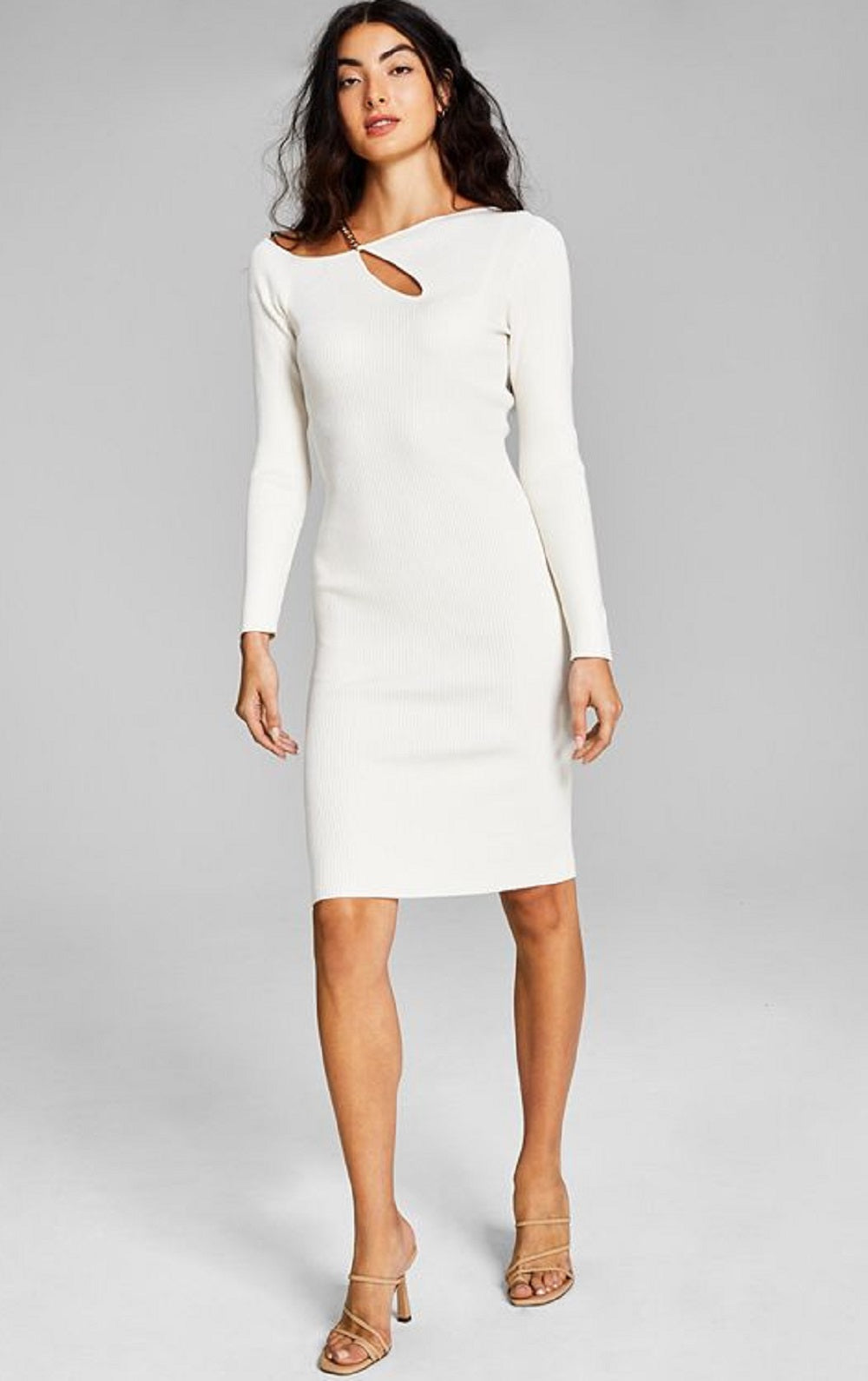 Uma escolha que abraça as curvas da And Now This | este vestido de suéter de manga comprida apresenta um recorte no decote acentuado por uma corrente chique