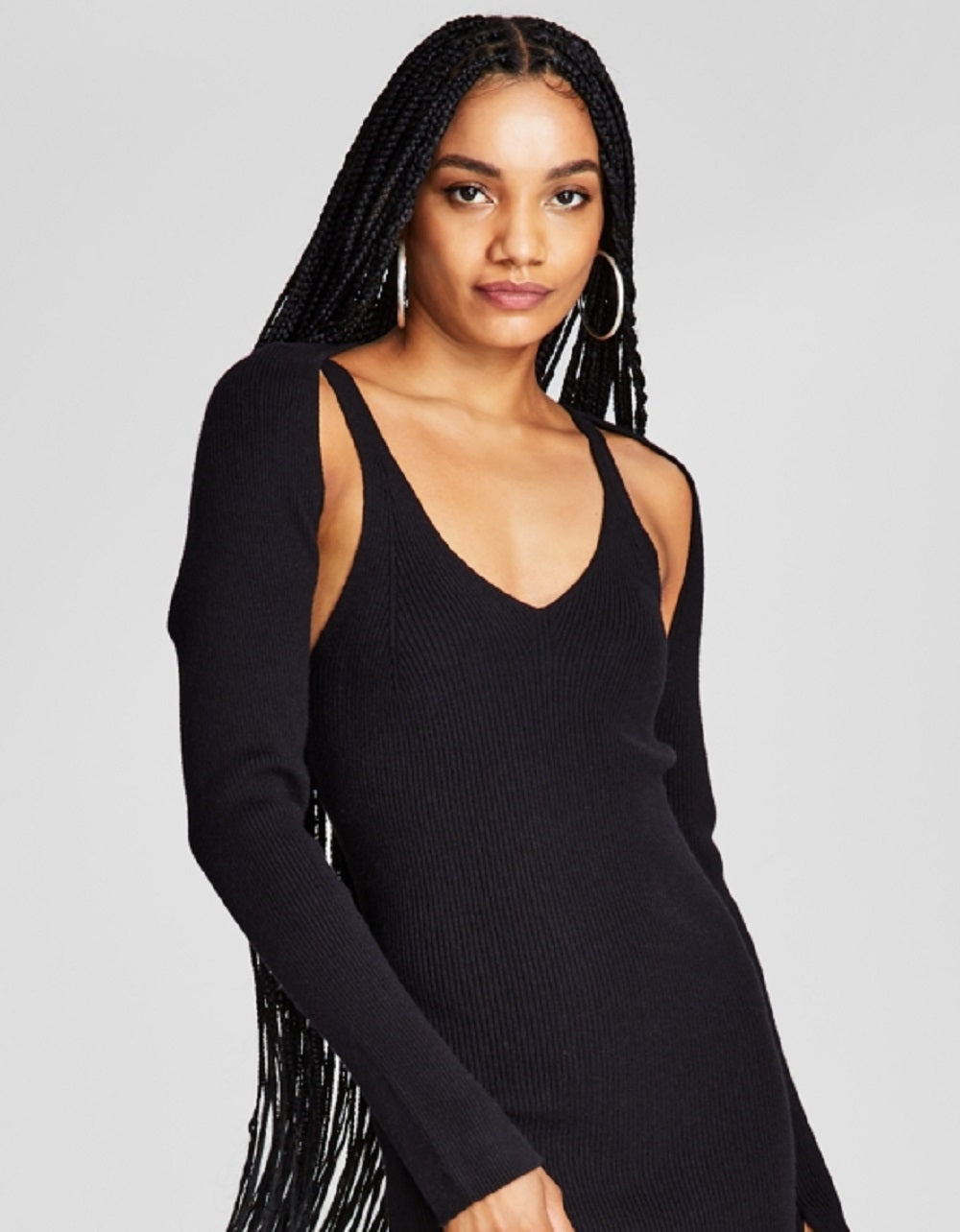 E agora este vestido justo feminino de malha canelada e ombros de fora, preto, tamanho X-S