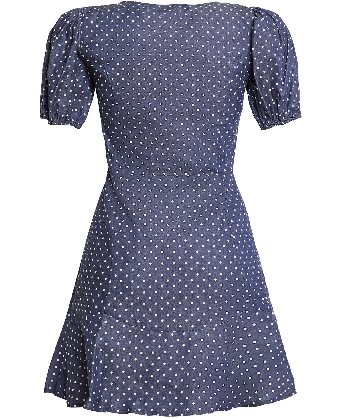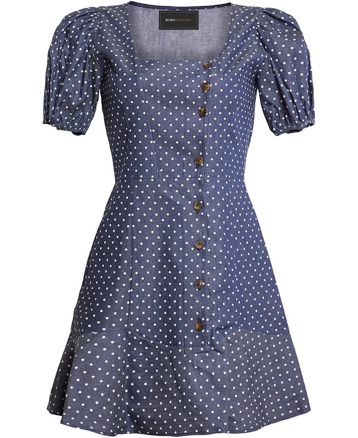 O minivestido de sarja de algodão da BCBGMAXAZRIA é tecido com um padrão de bolinhas | com decote quadrado | mangas curtas bufantes | botões decorativos na frente e uma saia justa e evasê. | Decote quadrado | Estilo pulôver | Mangas curtas bufantes com punhos elásticos