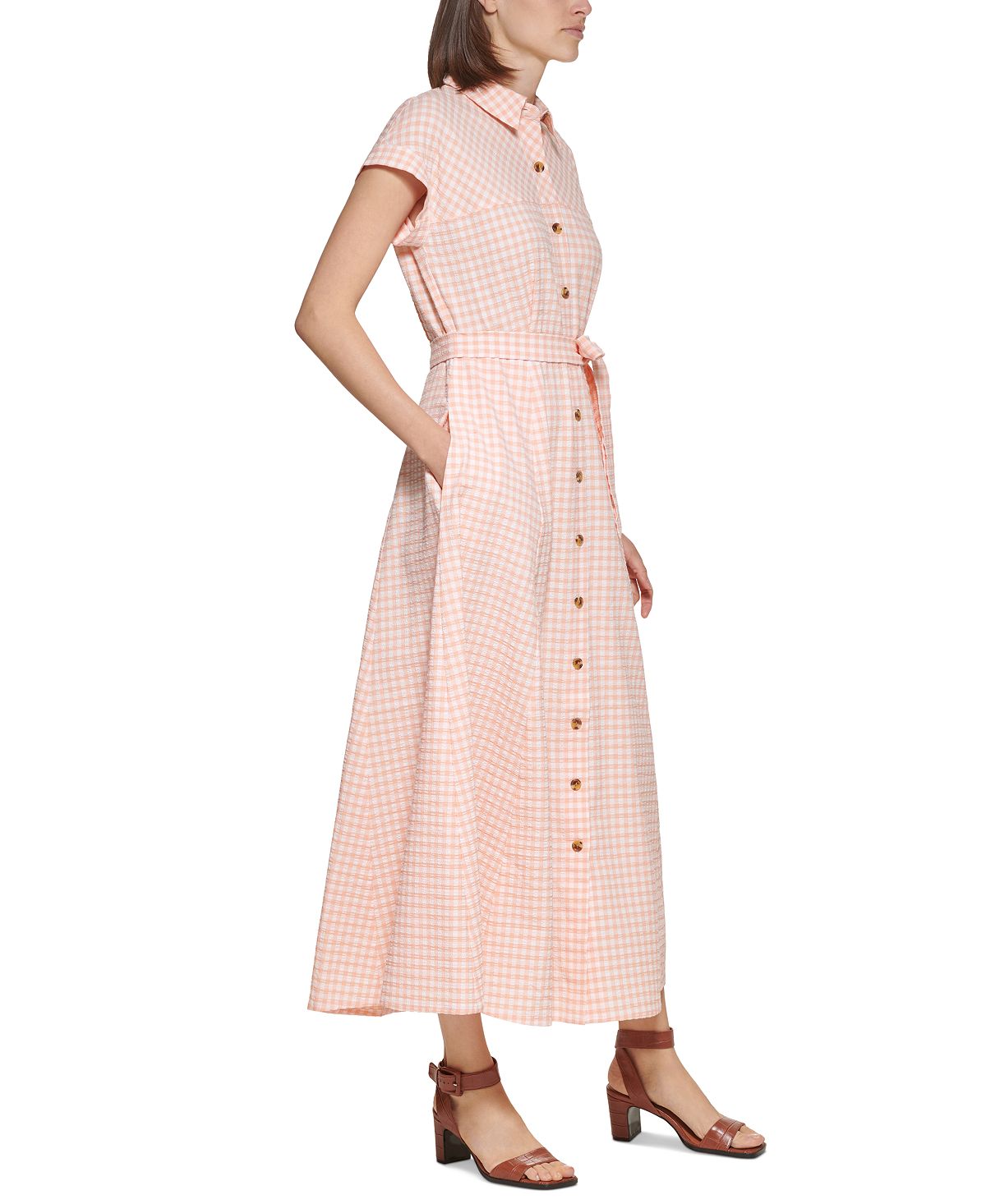 O xadrez xadrez de última geração é levemente texturizado e elegantemente ajustado neste vestido-camisa com cinto da Calvin Klein. | Comprimento aproximado de 52 cm, do centro das costas até a bainha. O comprimento é baseado no tamanho 6 e varia 1/4 entre os tamanhos | Cai abaixo do joelho até a panturrilha inferior | Gola pontuda; Vestido-camisa com silhueta midi | Fecho frontal com botões | Mangas curtas estilo dolman com punhos | Cinto para amarrar na cintura