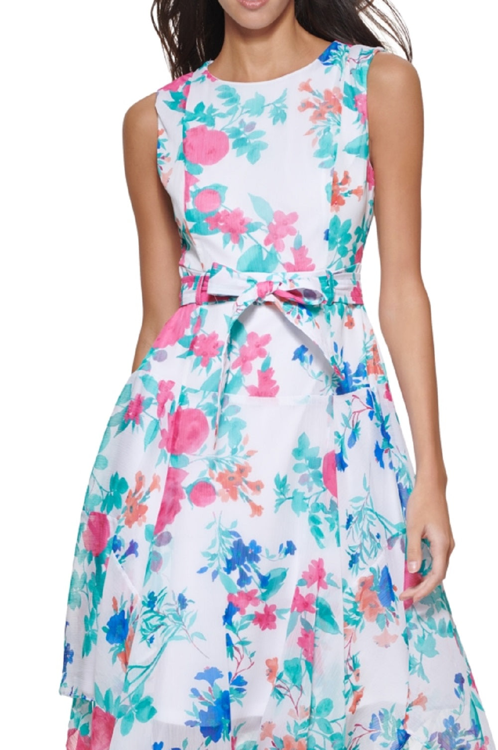 Uma escolha incrivelmente linda da Calvin Klein | este vestido pequeno apresenta uma estampa floral desabrochando e bainha alta e baixa