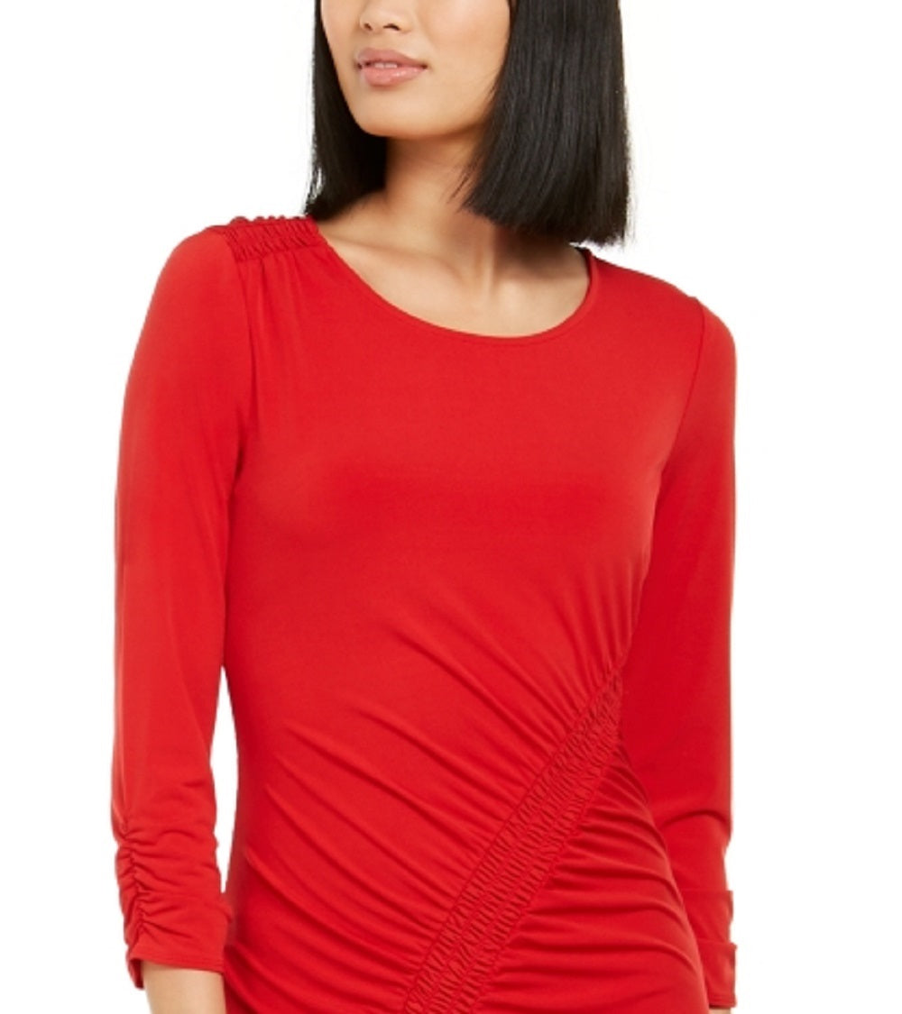 Aproximadamente 36" de comprimento | Gola redonda; Silhueta midi | Estilo pulôver | Mangas 3/4 | Smocking completo; Bainha tulipa assimétrica