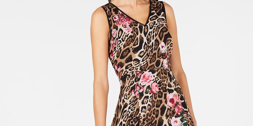Vestido midi trapézio bege estampado sem mangas com decote em V, tamanho 4, dourado, da INC International Concepts