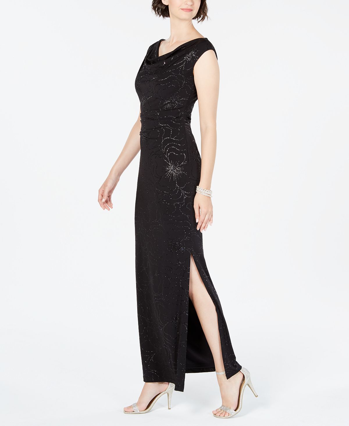 Elegante com um caimento perfeito | O vestido longo de Jessica Howard envolve seu corpo com flores em tons brilhantes. | Comprimento aproximado de 145 cm, do centro do pescoço até a bainha. O comprimento é baseado no tamanho 6 e varia 1/4 entre os tamanhos | Decote canoa | Zíper lateral oculto com fecho de colchete | Estampa floral metálica em tons; franzido na lateral da cintura; fenda na bainha lateral