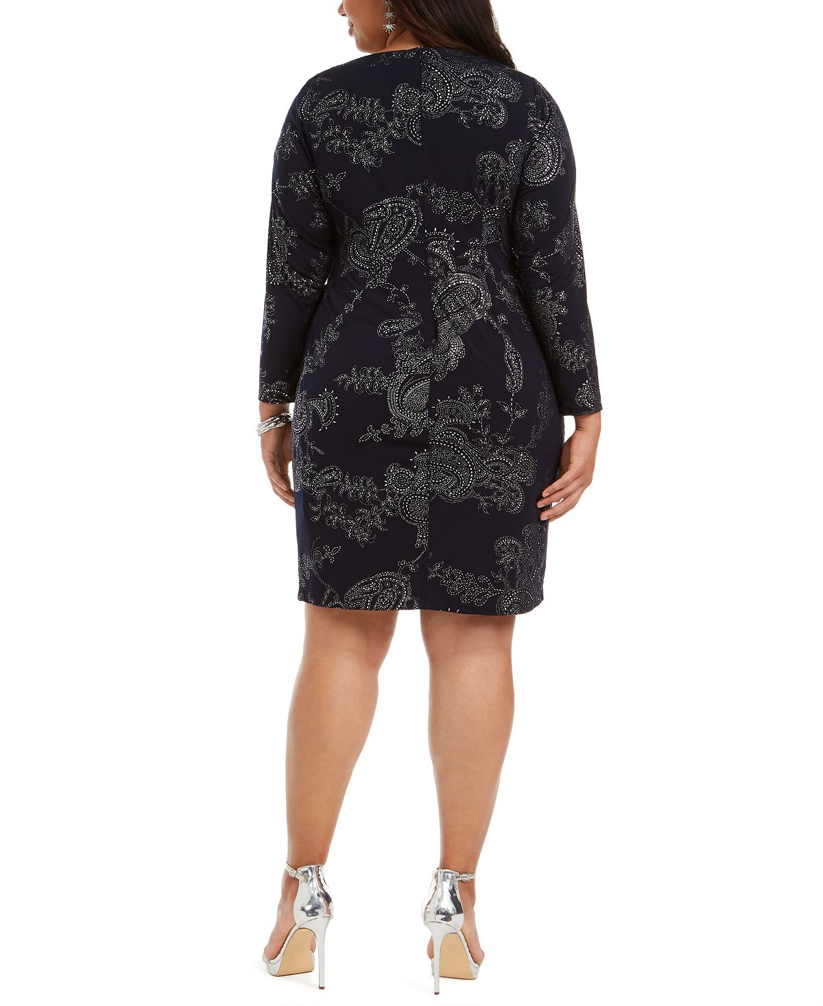 Franzido lateral para um caimento perfeito | O vestido plus size de Jessica Howard com estampa paisley com detalhes metálicos vai te acompanhar do escritório à noite. | Comprimento aproximado de 39, do centro do pescoço até a barra. O comprimento é baseado no tamanho 44 e varia 1/4 entre os tamanhos | Decote redondo; corte reto | Fecho de zíper oculto no centro das costas | Mangas 3/4
