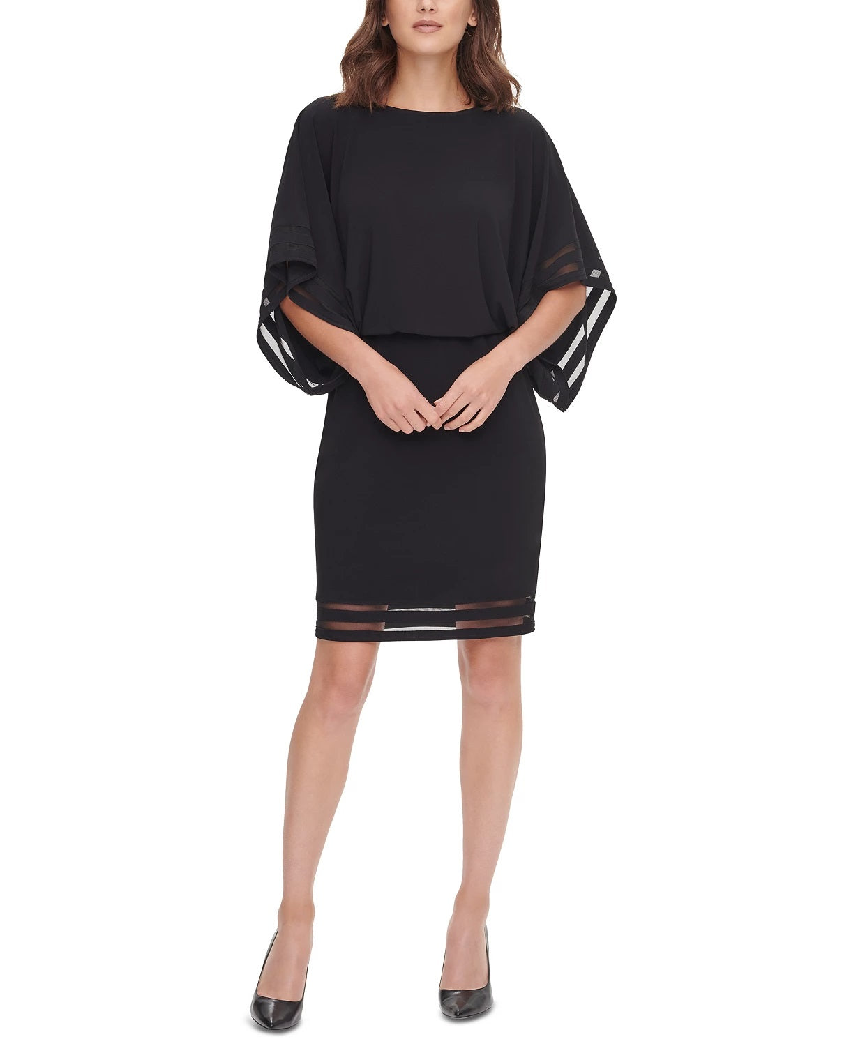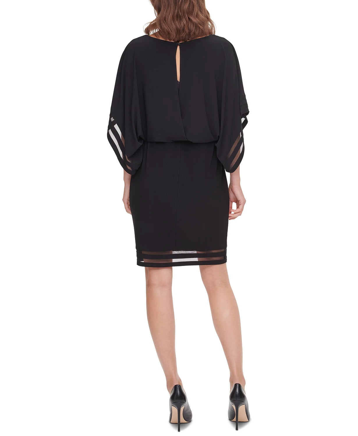 Decote canoa; Silhueta justa | Mangas dolman | Zíper traseiro oculto com fecho de colchete | Acabamento ilusão nas mangas e na bainha