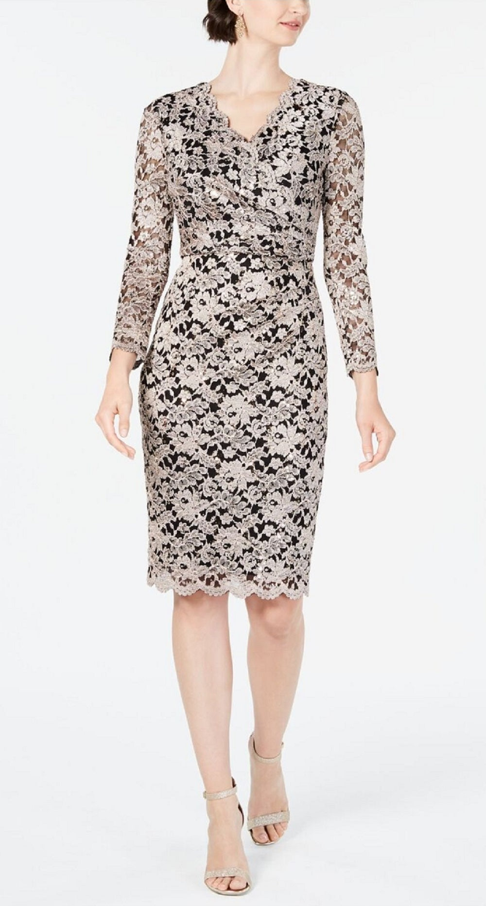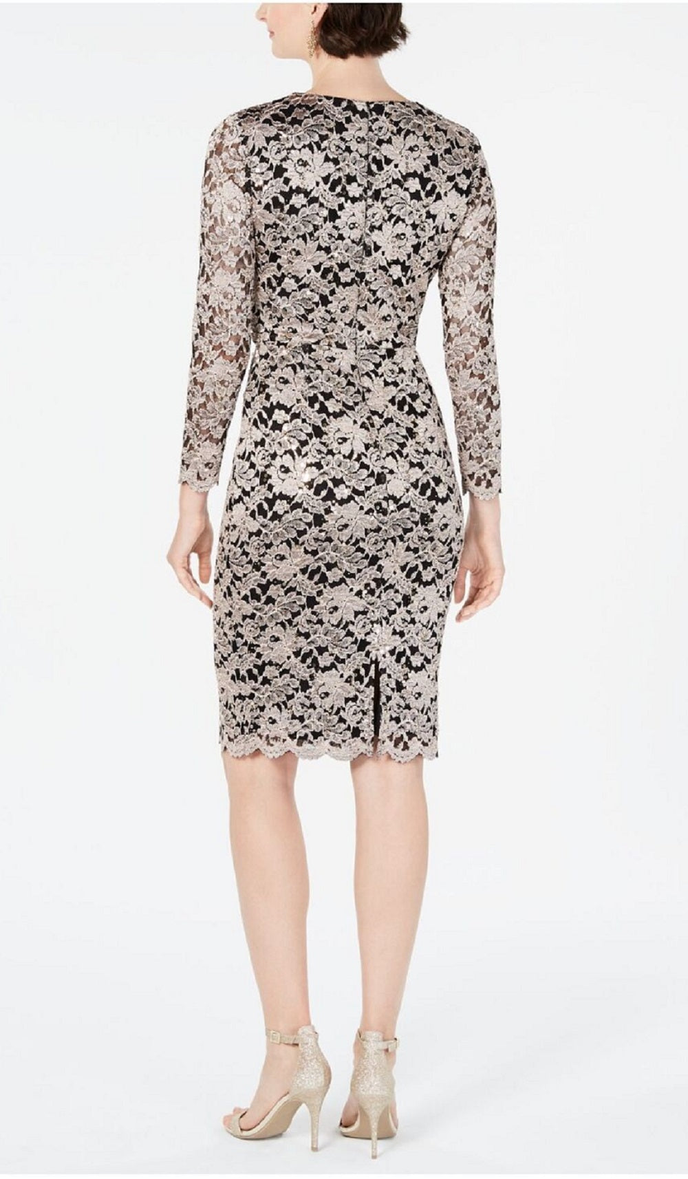 Elegante em todas as ocasiões com este vestido justo Jessica Howard. A renda com lantejoulas captura e reflete a luz lindamente. | Comprimento aproximado de 99 cm, do centro do pescoço até a bainha. O comprimento é baseado no tamanho 6 e varia 1/4 entre os tamanhos. | Decote sobrepeliz; Corte justo. | Zíper traseiro oculto com fecho de colchete. | Renda com lantejoulas por toda a peça. | NOTA IMPORTANTE: Este item chega com uma etiqueta de devolução anexada e instruções para remoção. Após a remoção da etiqueta do vestido.
