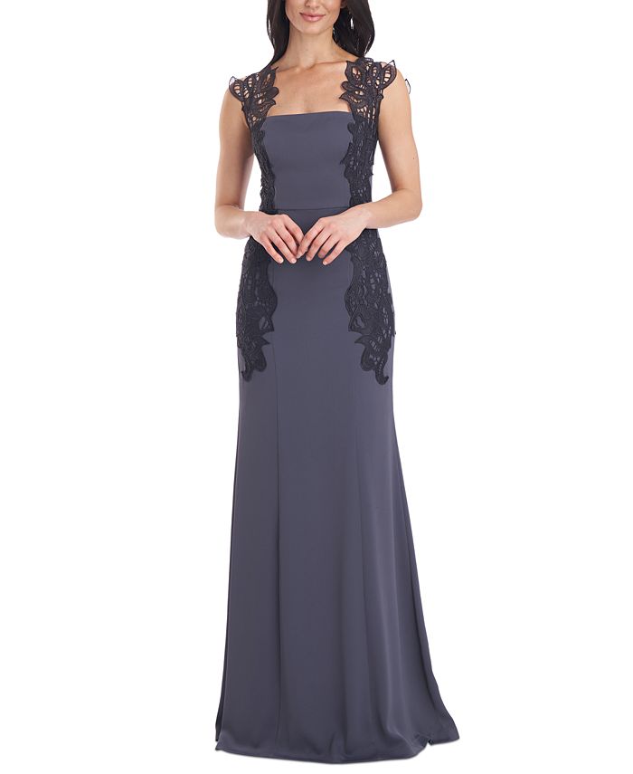 O acabamento em renda deslumbra neste vestido da JS Collections, pronto para eventos, com um lindo corte sereia para uma silhueta deslumbrante. | Aproximadamente 60 cm de comprimento, do centro do pescoço até a bainha. O comprimento é baseado no tamanho 4 e varia 1/4 entre os tamanhos | Fiel ao tamanho; peça seu tamanho normal | Vestido formal longo | Elástico e com sustentação