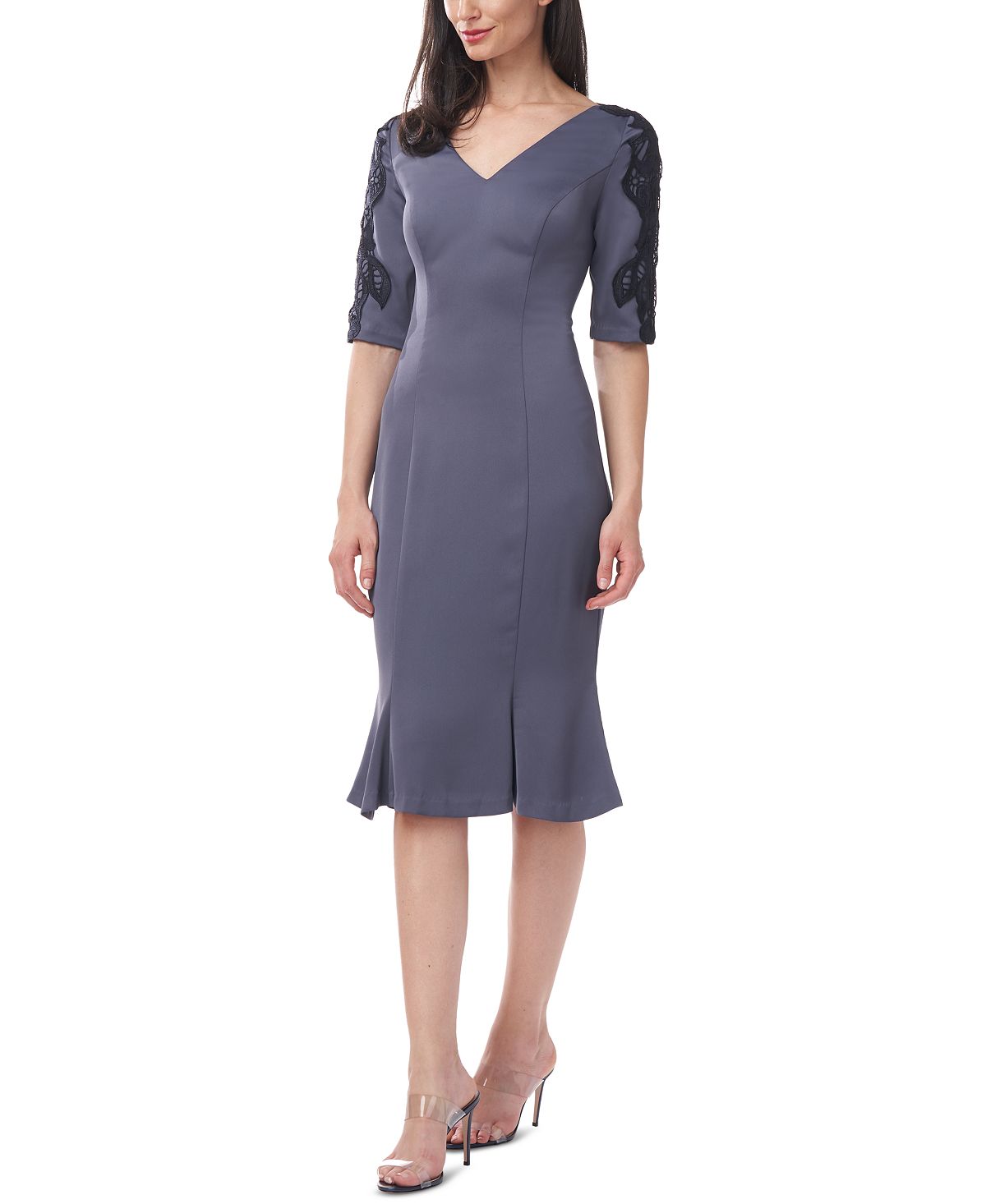 Com modelagem ajustada e evasê exatamente onde deve ser | este vestido na altura do joelho da JS Collections apresenta mangas até o cotovelo com um detalhe extra. | Comprimento aproximado de 10,5 cm, do centro do pescoço até a bainha. O comprimento é baseado no tamanho 4 e varia 1/4 entre os tamanhos | Ajustado no busto e na cintura; saia evasê e fluida | Decote em V; silhueta ajustada e evasê | Fechamento com zíper nas costas