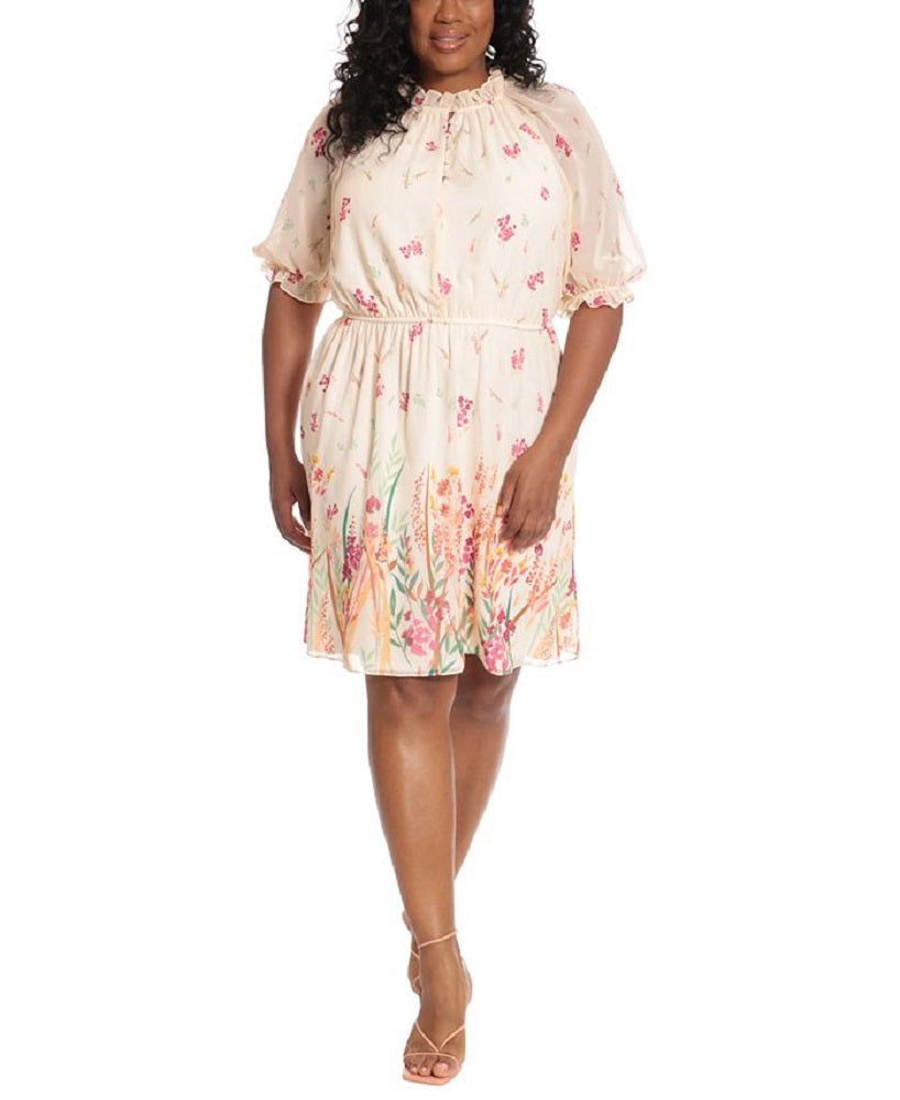 O London Times dá a este vestido plus size uma cintura marcada para dar mais forma e um acabamento em chiffon para uma sensação arejada