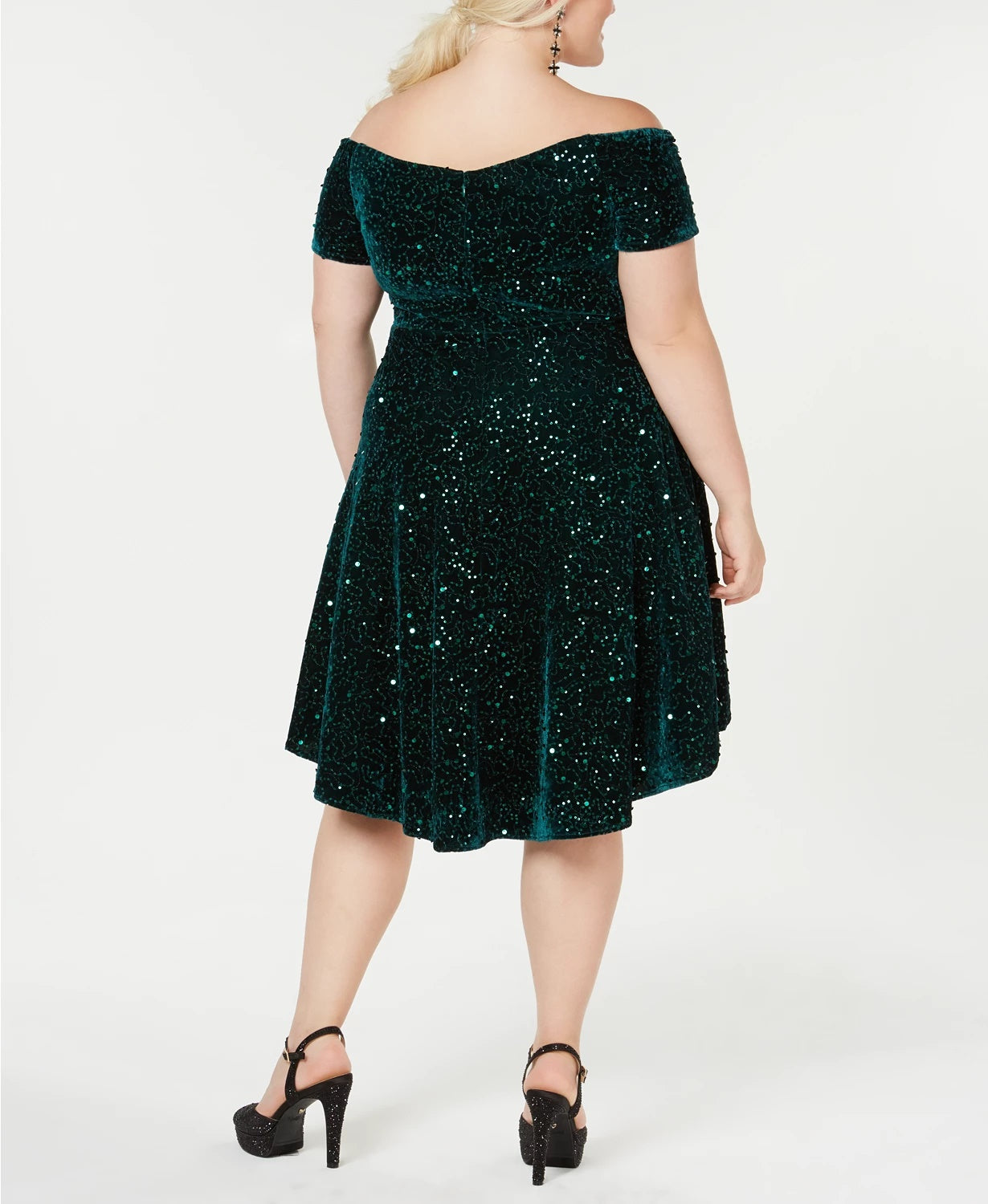 Decote ombro a ombro | Veludo com lantejoulas por toda a peça; bainha alta e baixa | Importado | Fecho de zíper nas costas | ID da Web: 6367295