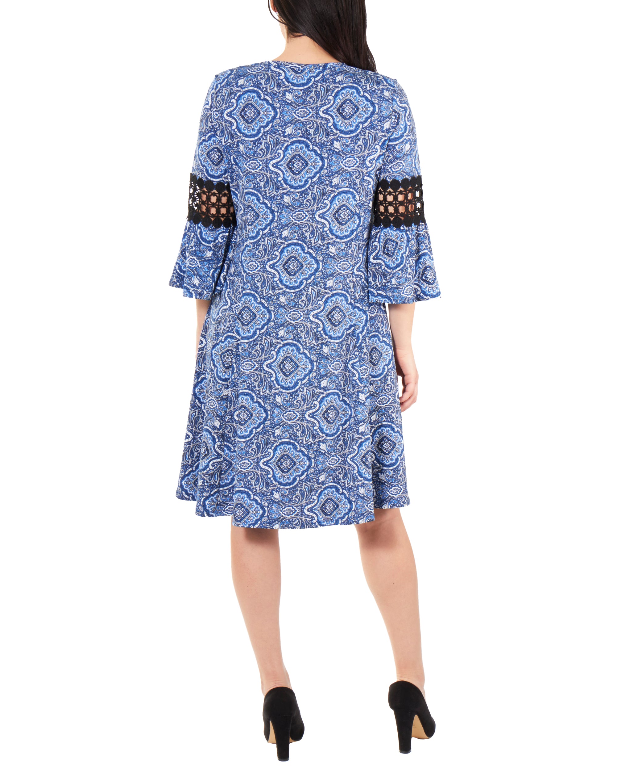 Vestido feminino NY Collection com manga sino e acabamento em crochê, azul, tamanho pequeno médio