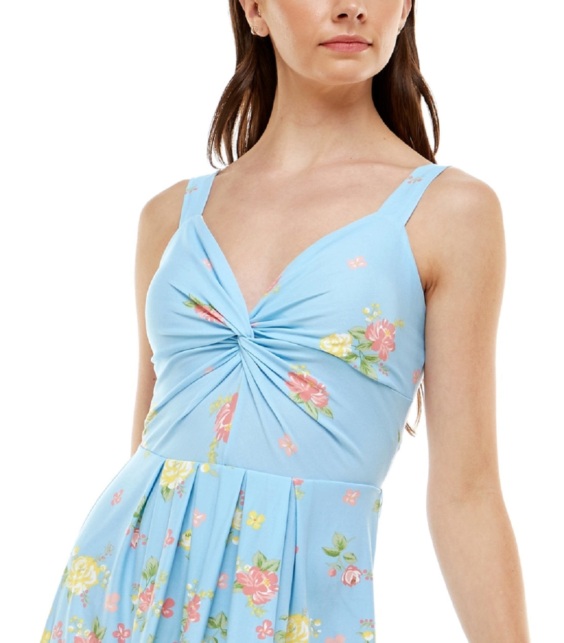 Lindas flores adornam este vestido da Planet Gold. Projetado com um caimento que valoriza o corpo e uma silhueta evasê. | Aproximadamente 71 cm de comprimento, do centro do pescoço até a bainha. O comprimento é baseado no tamanho médio e varia de 1/2 entre os tamanhos. | Forma pequena; se estiver entre tamanhos, peça um tamanho acima. | Ajustado no peito e na cintura; saia evasê e fluida. | Decote em V com detalhe torcido. Silhueta evasê e evasê. | Estilo pulôver.