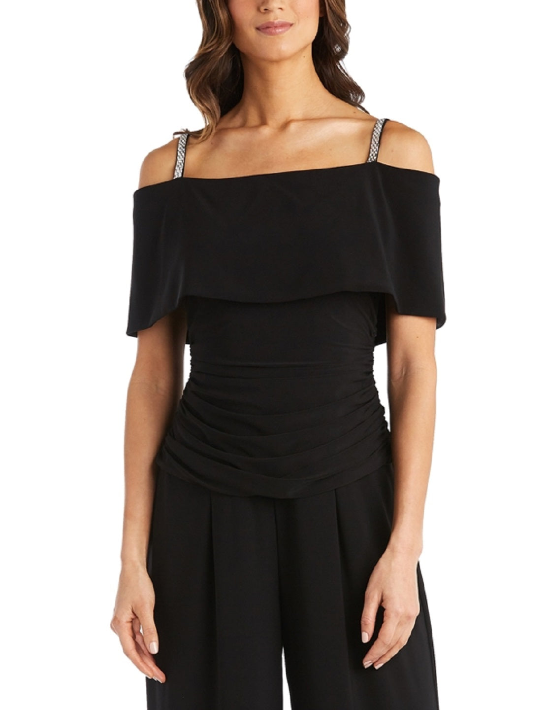 Macacão feminino R & M Richards com ombros descobertos, preto, tamanho 10, pequeno