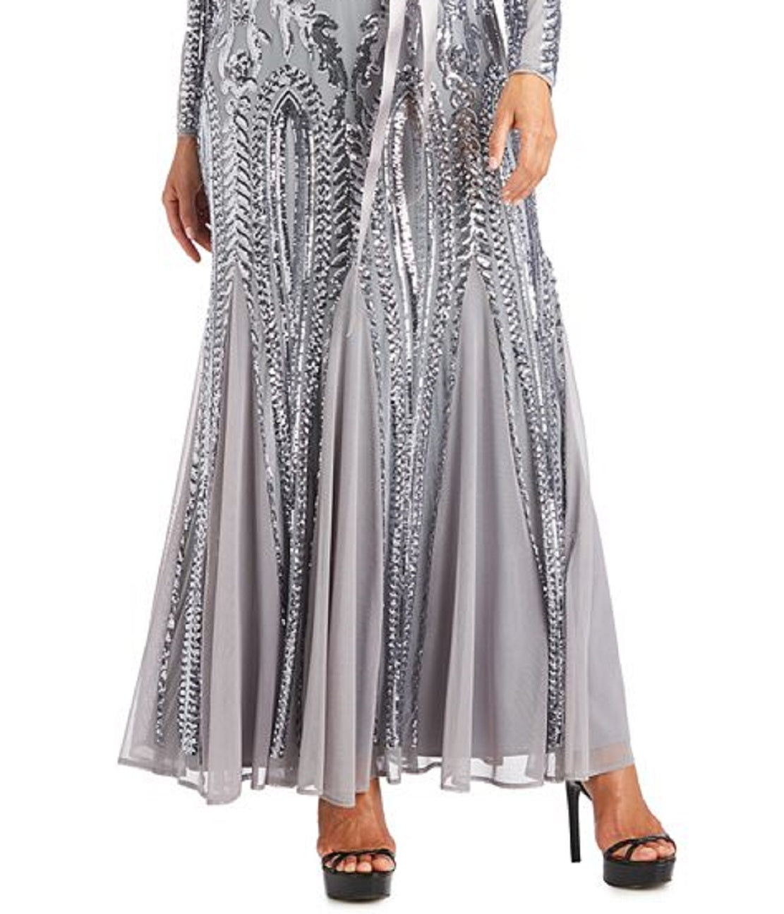 Os apliques de godê na saia dão um volume extra ao seu passo neste vestido brilhante de manga longa da R & M Richards. | Decote coração; Silhueta do vestido | Importado | Lantejoulas por toda a peça; bojos moldados; cinto de cetim removível; apliques de godê na saia | Zíper traseiro oculto com fecho de colchete | | Fale com um estilista e receba aconselhamento especializado gratuito online ou em lojas para o seu guarda-roupa