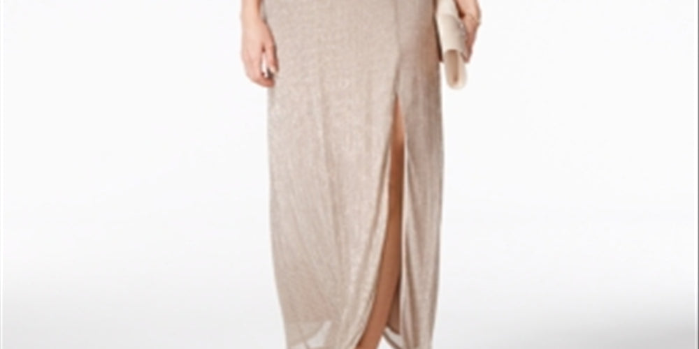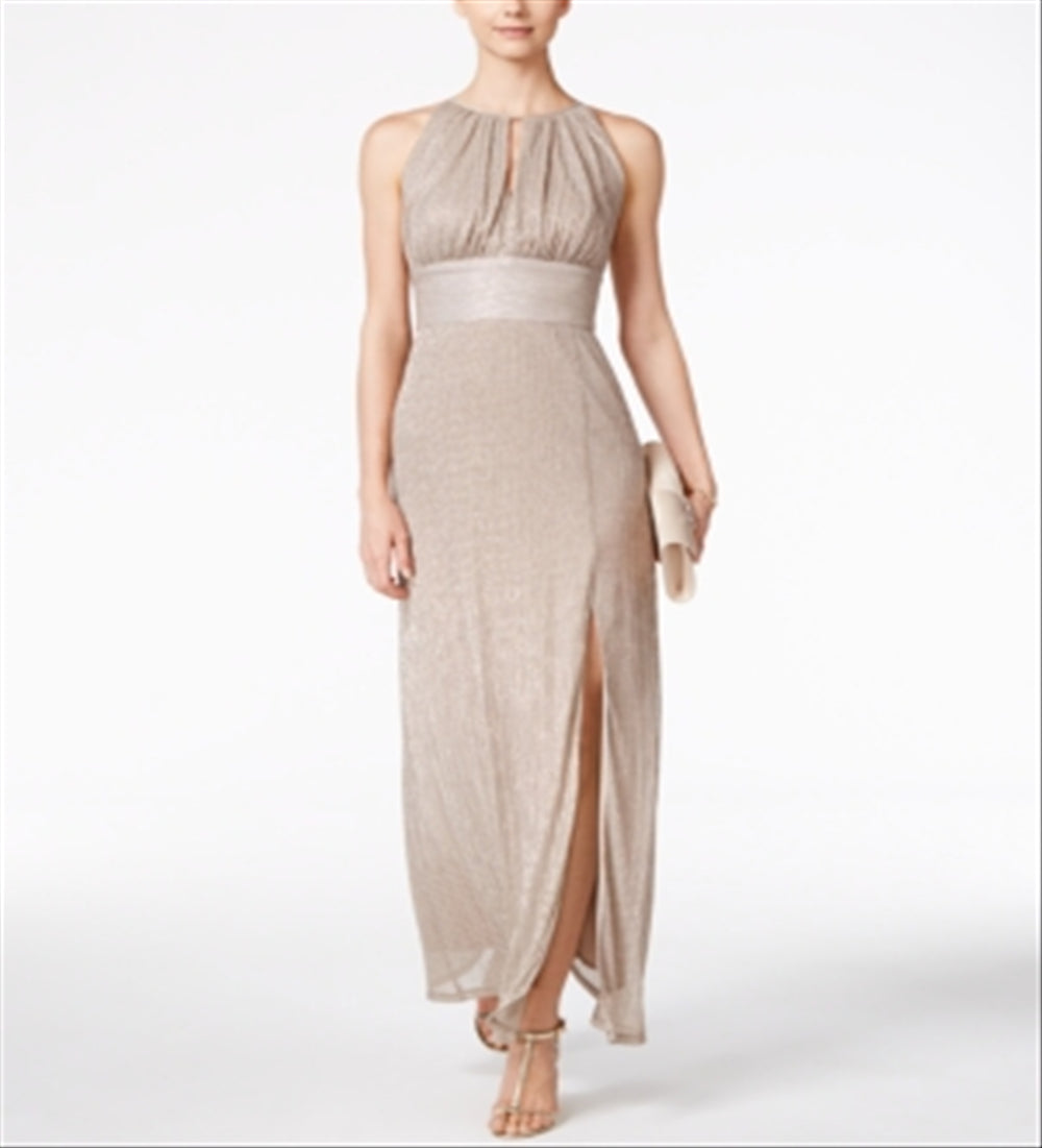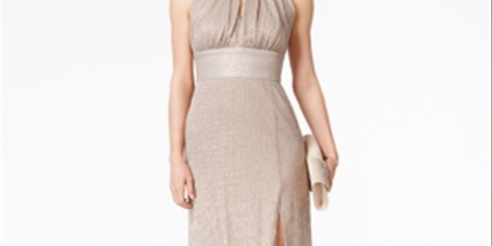 Vestido feminino R & M Richards com decote halter e decote em V em malha metálica, tamanho 16, dourado