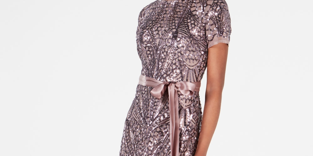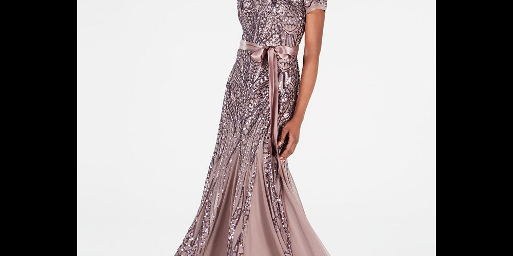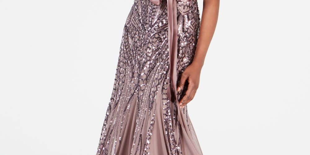 Uma elegante fita de cetim acentua a cintura deste vestido glamoroso da R & M Richards | deslumbrante com lantejoulas e pregas godê