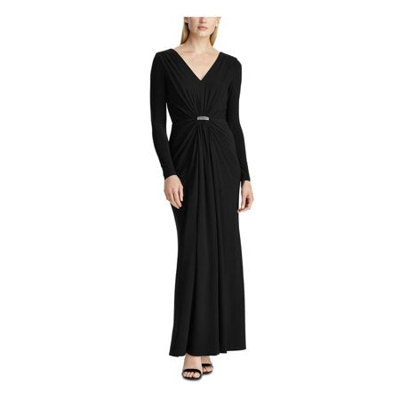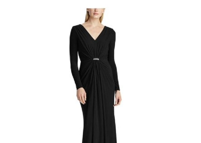 Vestido de noite longo com strass e decote em V, manga comprida, estilo flare, Ralph Lauren, preto, tamanho 12