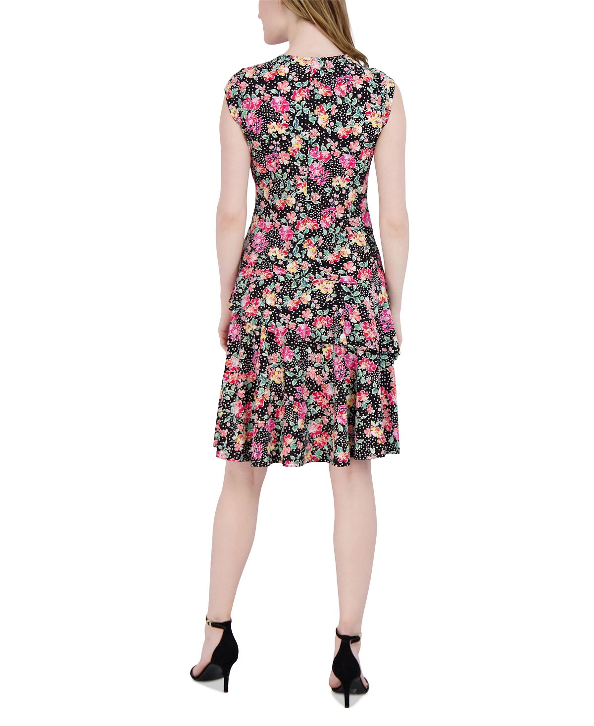 Um buquê de flores ilumina este pequeno vestido de jersey da Robbie Bee, enquanto babados românticos dão o toque final perfeito. Franzido na cintura lateral; babado na saia. Mangas curtas. Malha jersey. Macio e elástico. Importado. XS=0P-2P.