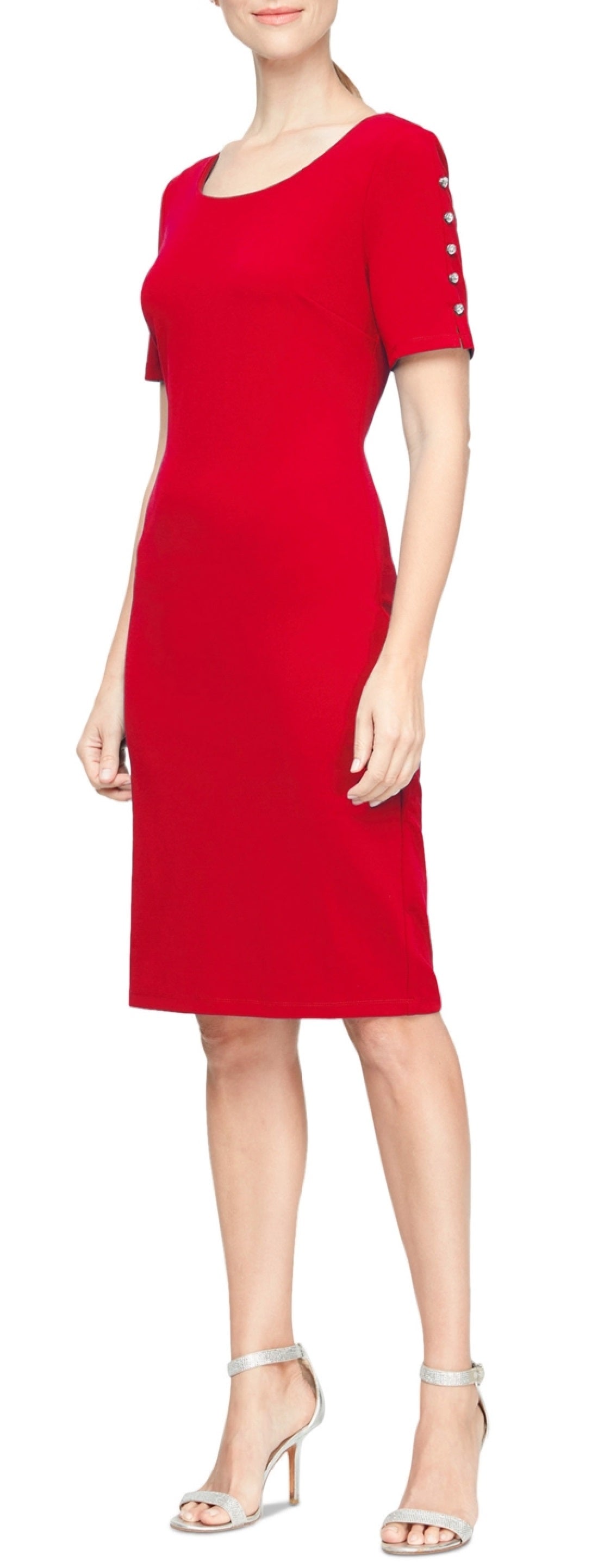 O formato aerodinâmico deste vestido tubinho da SL Fashions é complementado com pontos brilhantes nas mangas para iluminar um dia de trabalho ou uma noite de festa. | Forrado | Decote redondo; Silhueta tubinho | Importado | Fecho de zíper nas costas | Enfeite de contas nas mangas curtas |