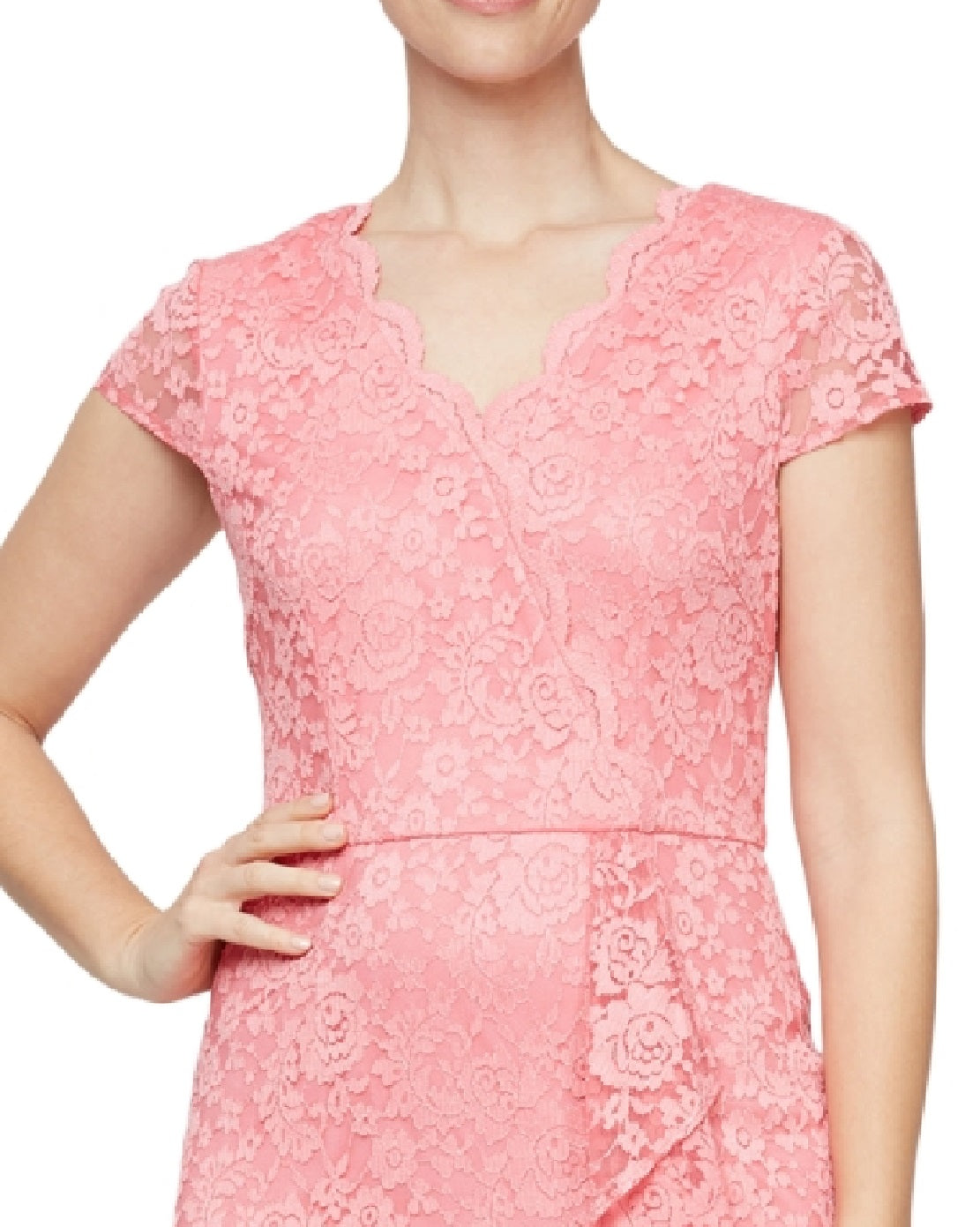 A SL Fashions atualiza um vestido tubinho atemporal com renda elegante e um babado romântico, tornando-o a escolha perfeita para o seu próximo evento especial. | Comprimento aproximado de 94 cm, do centro do pescoço até a bainha. O comprimento é baseado no tamanho 8 e varia 1/4 entre os tamanhos. | Decote em V recortado; corte tubinho. | Fecho de zíper nas costas. | Acabamento com babado na frente. | Forrado.