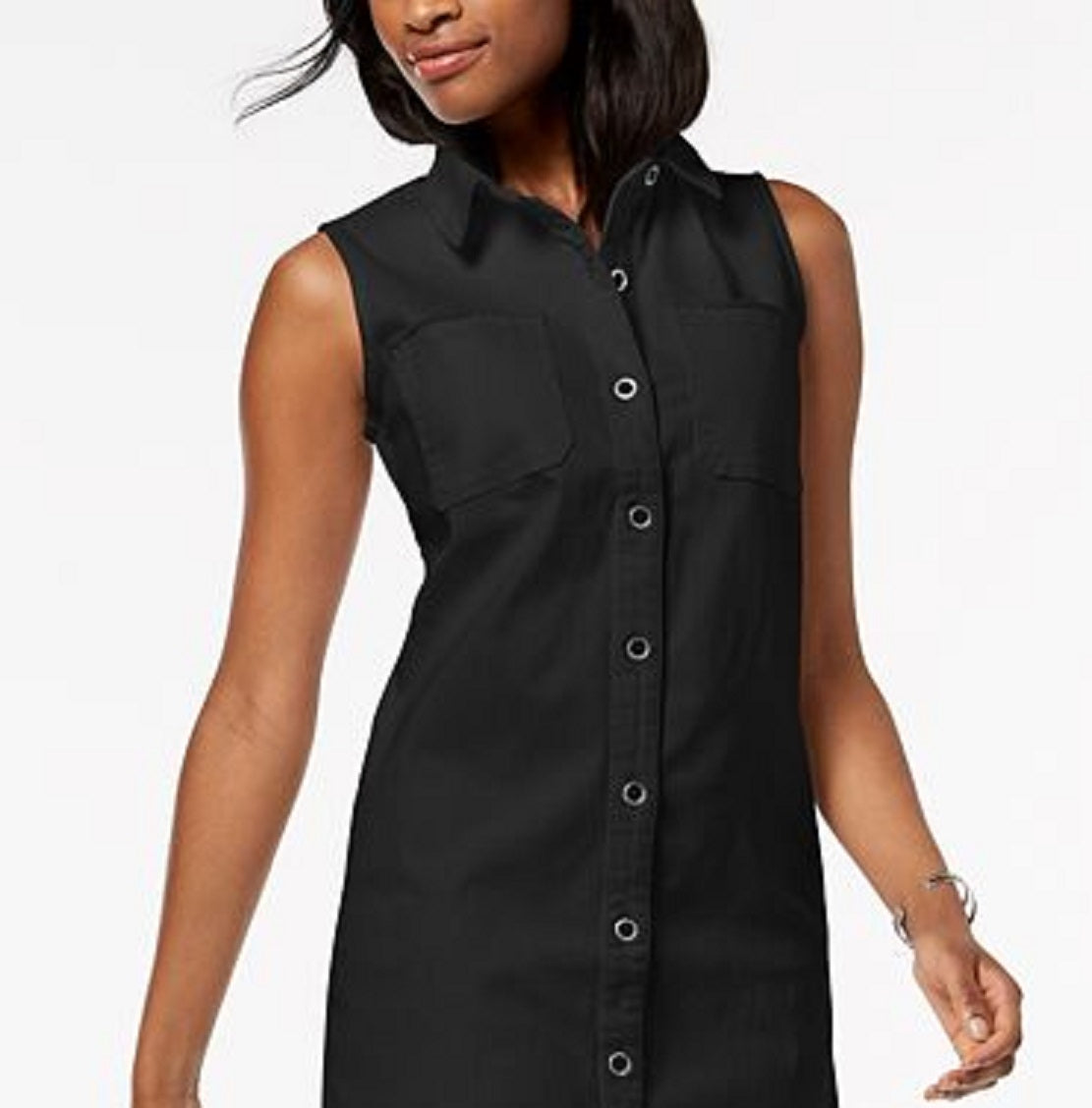 O acabamento desfiado adiciona um toque de charme descontraído ao pequeno vestido-camisa jeans da Style & Co, com decote clássico e fechos frontais com botões