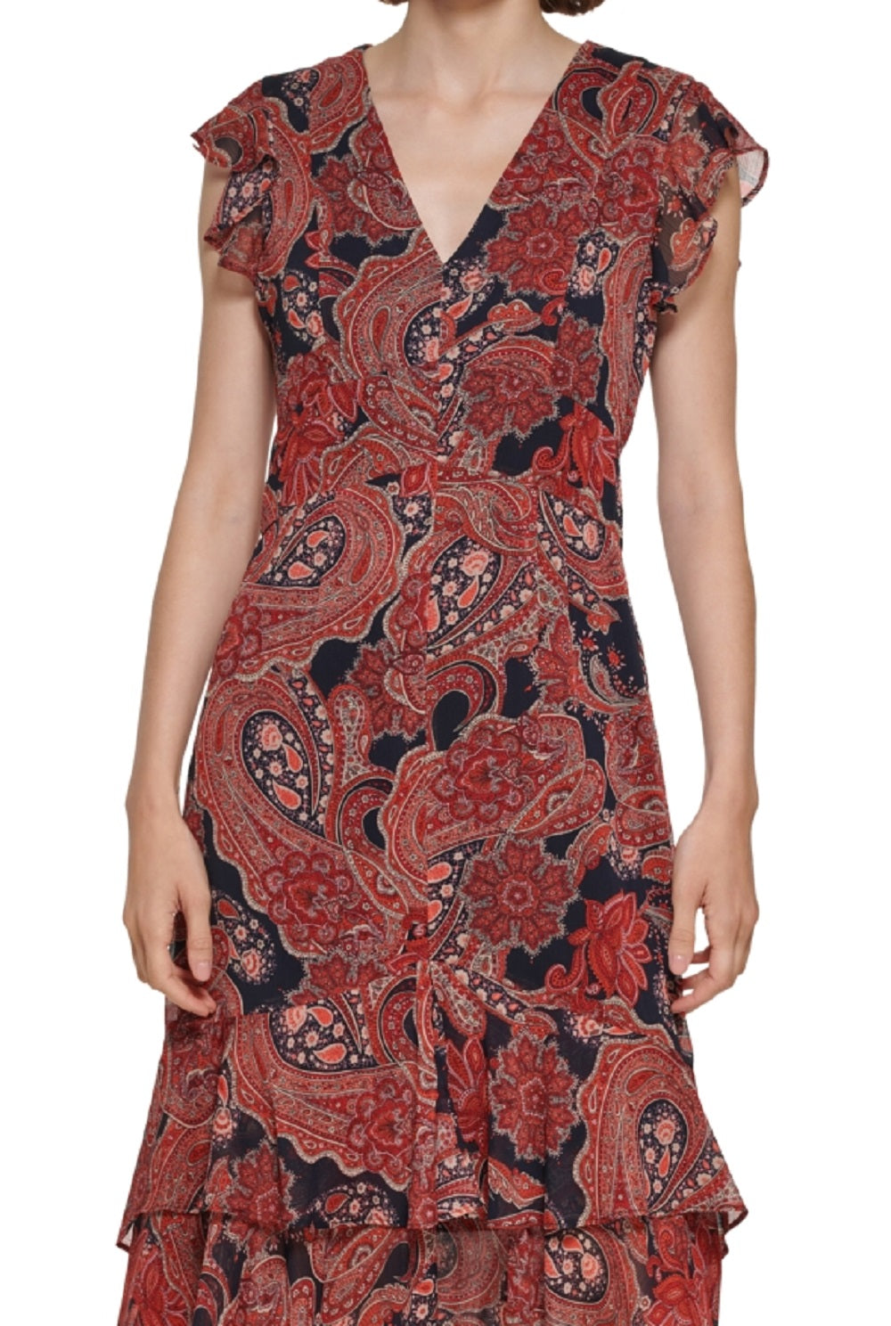 Cause uma boa impressão com o elegante vestido paisley de mangas esvoaçantes da Tommy Hilfiger | com babados na bainha alta e baixa. | Comprimento aproximado de 50 cm, do centro das costas até a bainha. O comprimento é baseado no tamanho 6 e varia 1/4 entre os tamanhos. | Modelagem fiel ao tamanho; peça seu tamanho normal. | Caia abaixo do joelho até a panturrilha. | Chiffon; Suave | Tecido transparente.