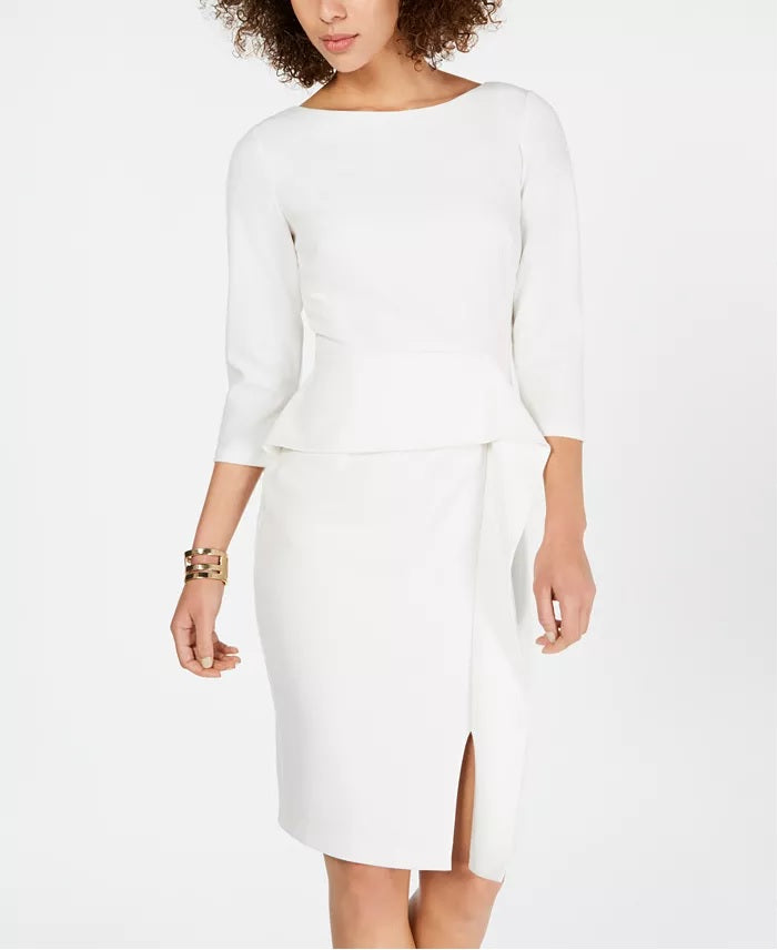 Aproximadamente 107 cm de comprimento do centro das costas até a bainha. O comprimento é baseado no tamanho 6 e varia 1,6 cm entre os tamanhos. | Decote canoa; corte justo | Zíper central oculto nas costas e fechos de colchete | Mangas 3/4 | Peplum na cintura; babados na frente | Poliéster/rayon/elastano; forro: poliéster