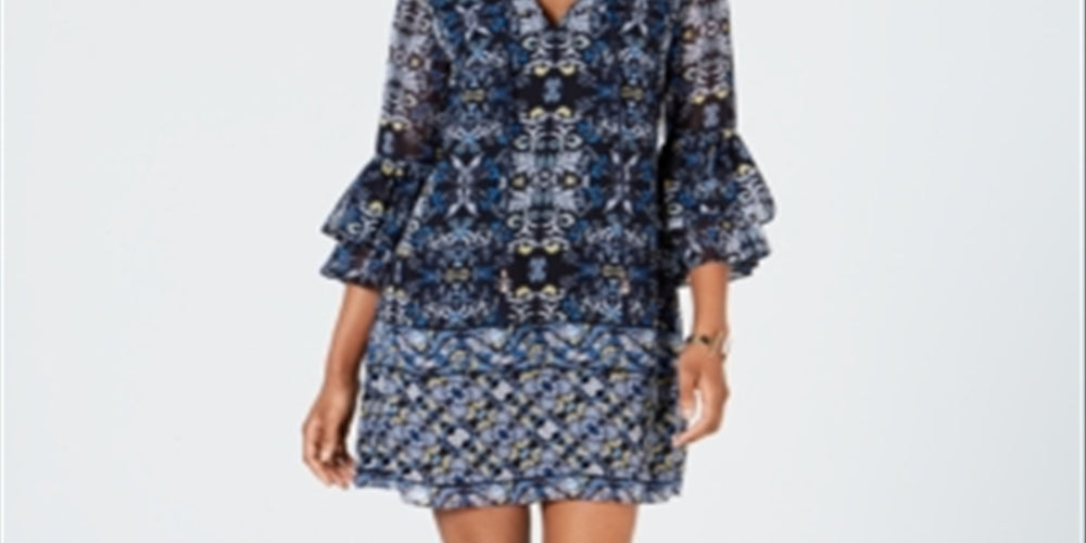 Vince Camuto aperfeiçoa o visual de estampa mista neste vestido despojado | um estilo de chiffon esvoaçante finalizado com mangas volumosas e laços de borla na frente