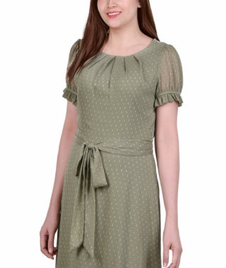 Vestido feminino NY Collection com manga curta e cinto, bolinhas suíças, verde, tamanho pequeno grande