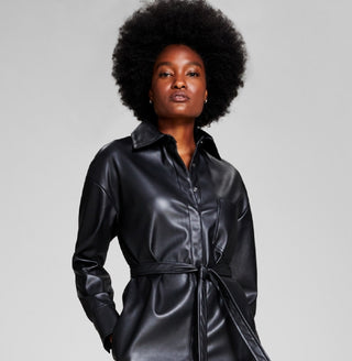 E agora este vestido-camisa feminino de couro sintético com cinto, preto, tamanho pequeno