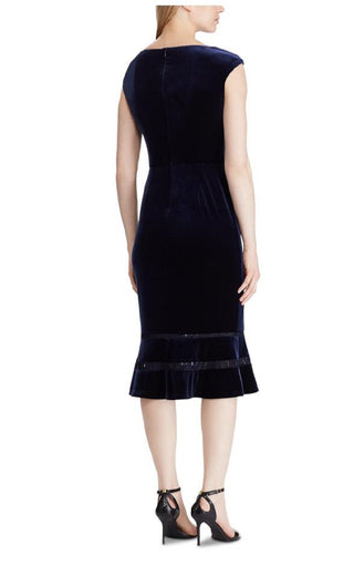 Vestido de festa feminino Ralph Lauren com manga curta, decote em V e bainha MIDI, azul, tamanho 0