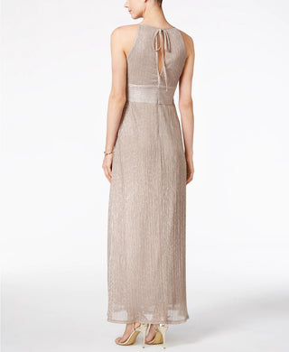 Vestido feminino R & M Richards com decote halter e decote em V, tamanho 14, dourado