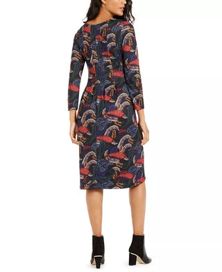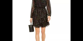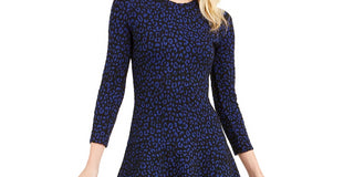 Vestido curto evasê Michael Kors feminino estampado, manga comprida, gola redonda, preto e azul, tamanho pequeno e pequeno