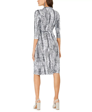 Vestido DKNY Feminino Listrado com Strass e Manga Longa, Decote em V Acima do Joelho, para Usar no Trabalho, Cinza, Tamanho 14