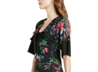 Vestido feminino Trina Turk com estampa floral, manga 3/4, decote em V abaixo do joelho, ajuste flare, preto, tamanho 14