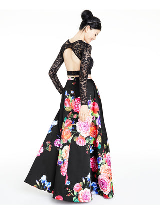 Vestido formal feminino B DARLIN com estampa floral e manga comprida, comprimento total, preto, tamanho 13/14