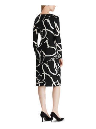 Vestido de festa feminino Lauren Ralph Lauren, estampado, manga comprida, decote em V, abaixo do joelho, preto, tamanho 4