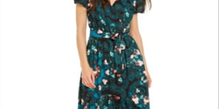 Vestido feminino floral com manga 3/4 e decote em joia, comprimento até o joelho, azul, tamanho 18W