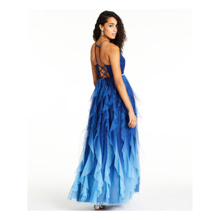 Vestido formal feminino Teeze Me com decote em V, sem mangas, comprimento chá, azul, tamanho 0