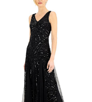 Vestido feminino J Kara com decote em V e contas, preto, tamanho 10