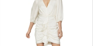 BCBGMAXAZRIA Vestido curto feminino de cetim pontilhado com babados e mangas compridas, decote em V, branco, tamanho 8
